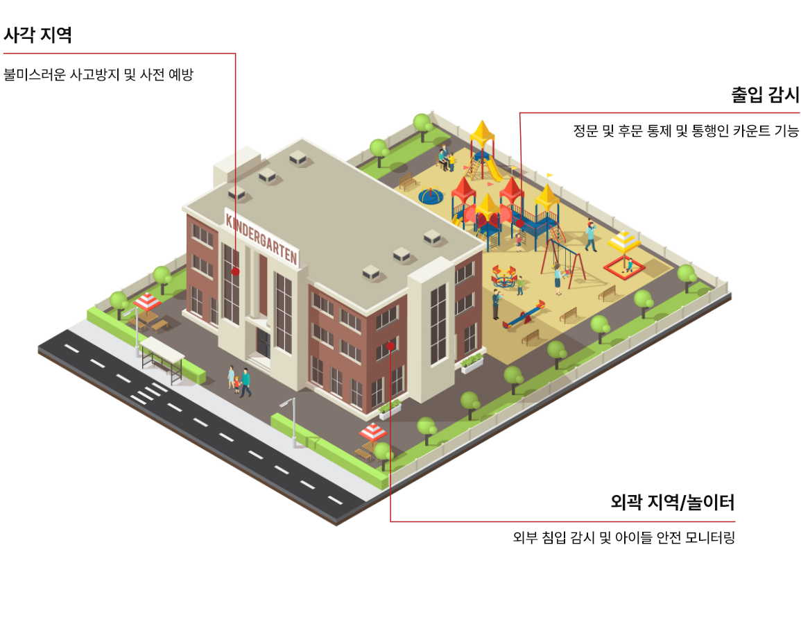 아이들 또는 미취학 아동의 안전을 보호하며 아이들의 이동 현황과 근황을 24시간 실내 또는 외부에서 스마트폰으로 관제할 수 있습니다. 출입구 같은 경우 외부의 침입자로부터 보호를 할 수 있고 외벽에 쓰레기 투기 같은 경우도 체크할 수 있습니다.