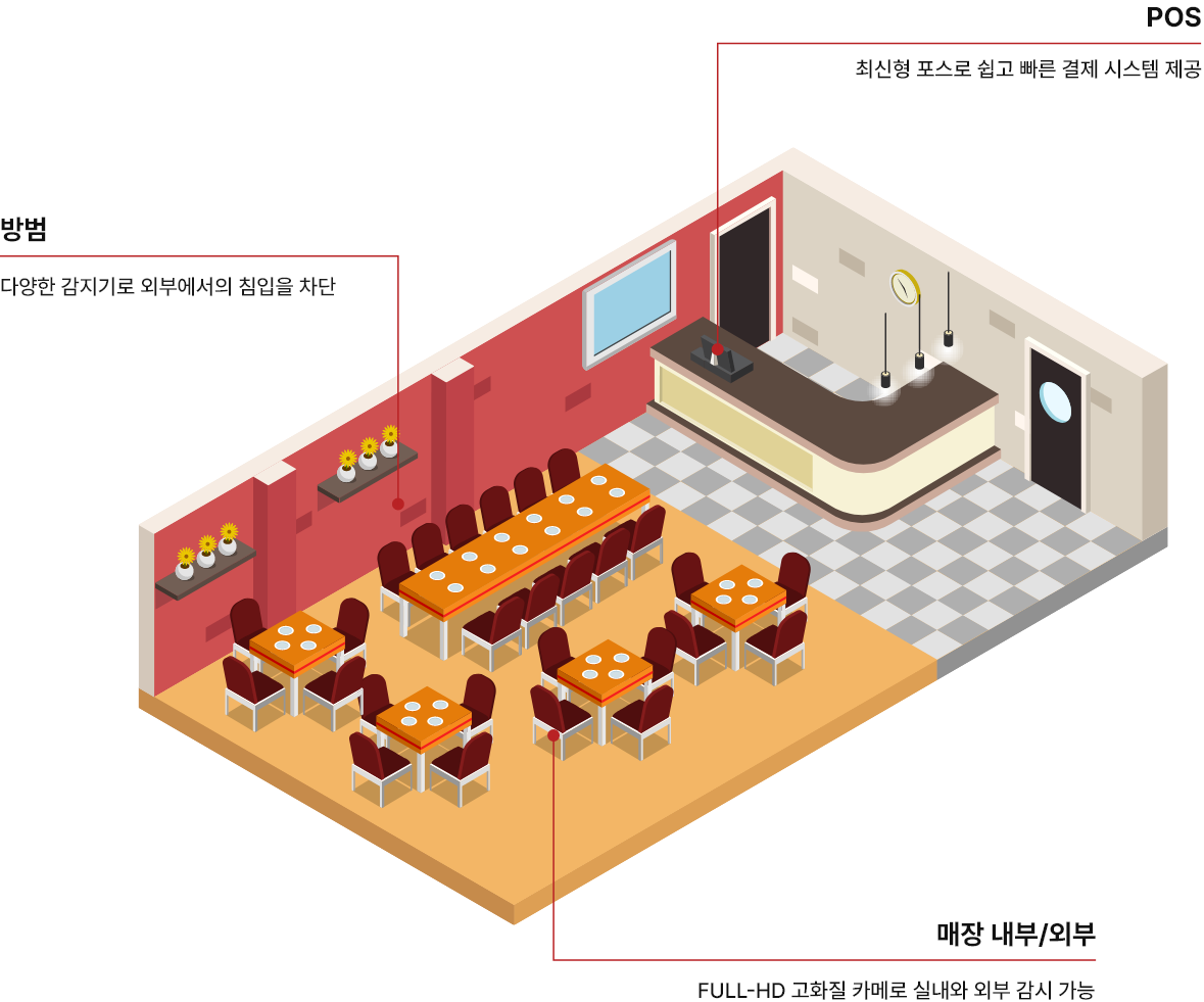 사업장의 영업 상태 또는 상품 훼손과 사건 사고를 신속하고 간편하게 확인할 수 있습니다. 추가적으로 외부 침입 가능성을 사전에 방지 및 감시할 수 있습니다.